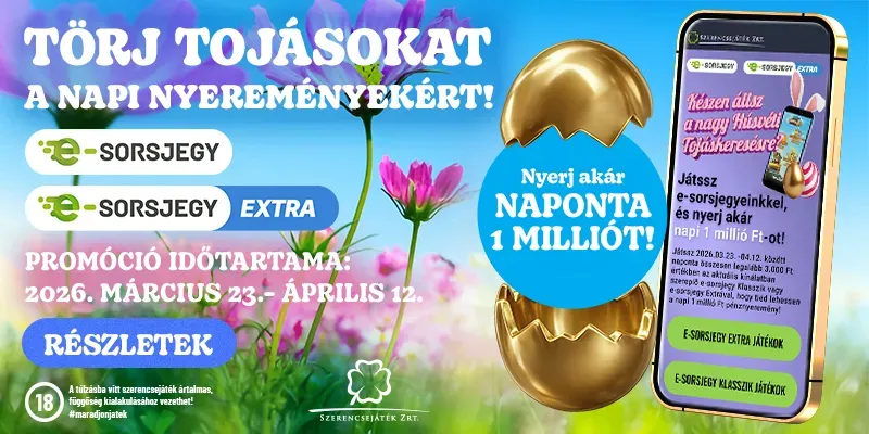 Szeretnéd, hogy az idei húsvét ne csak nyuszikról, tojásokról és locsolókról szóljon? Akkor játssz e-sorsjegyeinkkel legalább 3000 Ft értékben, és minden nap esélyed lehet az egymillió forintos nyereményre! Ha tojásokra is vadászol, akár ötvenszeres eséllyel is részt vehetsz a sorsoláson. Legyen igazán izgalmas az idei húsvét!