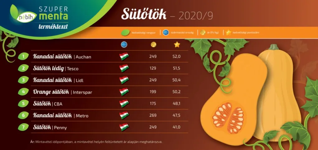 A kedveltségi vizsgálat során, minden értékelési szempontot figyelembe véve, az élen a Kanadai sütőtök (Auchan) végzett. A második helyezést a Sütőtök lédig (Tesco) nyerte el, míg a dobogó harmadik fokára a Sütőtök (Lidl) léphetett fel.