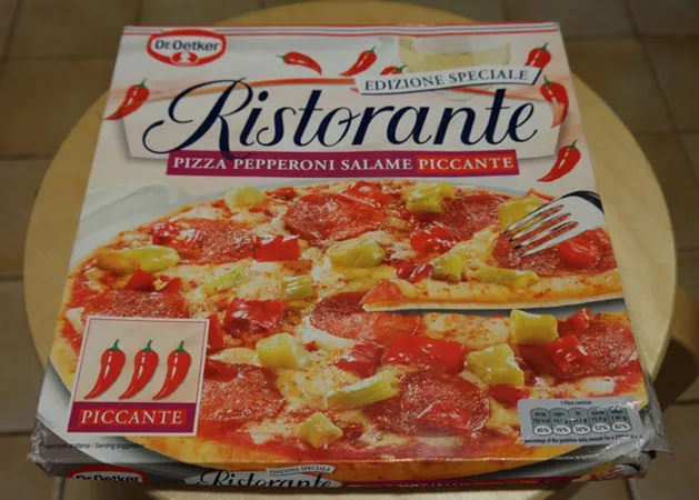 Ez a név sokak számára ismerősen csenghet, mivel a gyógyszerész Dr. August Oetker által alapított Dr. Oetker cég gyártja, meglepő módon nem Németországban, hanem Lengyelországban. A leírás és a feltétek sora egészen egyszerű, chili-paprikás és szalámis verzió. A dobozon egyből három paprika ikon is fityeg, ez biztos elrettenti még a mexikóikat is. Kibontva meglátjuk a 9 darab, szép nagy karika szalámit és két fajta paprikát, melyek piros és halványzöld színben pompáznak. A tészta egészen olaszos, azaz jó vékony. A sajt a paradicsomos szószon van egyből, így legalább látszanak a feltétek, igaz adagra egészen kevéske. Nyersen is egész kellemes, friss paradicsomillatot áraszt magából, és nem a megszokott paprikát érezni, mint legtöbb mirelit pizza esetében. Egészen sokáig kell sütőben hagyni, a dobozon lévő tanács szerint is 13-15 percig legalább. Kicsit elfeledkeztem magamról a tévé előtt, miközben Berényi Miki újabb kalandjait lestem, ezért egy kicsit hiperpigmentált szín jelentkezett a pizzán. A tészta jó ropogós lett. Vártam, hogy megkönnyeztet, de ez annyira csíp, mint egy bögre kakaó. A nevébe becsempészni egy ilyen pizzának, hogy picante, kissé pofátlan. A szalámi nemcsak látszatra tűnik rendes húsnak, hanem ízre is. A szósz kellemes paradicsomos, mondhatni finom is. A sajt mennyiségre sajnos sovány, pedig ez normális mozzarella.