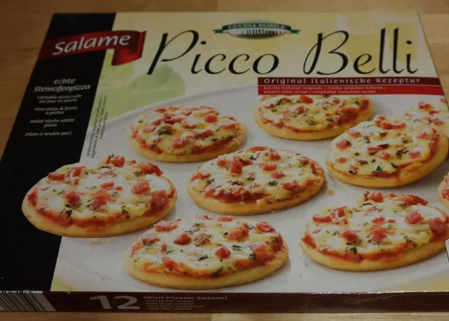Talán ez annyira nem illik bele a hagyományos mirelit pizza sorba mivel 12 darab kis mini pizzát tartalmaz a doboza. A leírás szerint 30 grammot nyom egyetlen darab, így a végeredmény 360 gramm. A leírásban extrém tételek nem nagyon szerepelnek, természetesen van benne tartósítószer, de a személyes kedvencem a nitrites „pácsó”. Kedves figyelmeztetést biggyesztettek az elkészítési javaslathoz, miszerint minden sütő más és más, ezért folyamatosan figyeljük a kis pizzákat, nehogy valamelyik elszenesedjen. Sima sütőben körülbelül 7-8 perc elegendő, a valóságban nálam hasonló eredmény született. A sajt ráolvadt a paradicsomos, darált szalámis alapra, egészen jól mutat. Tetején nyomokban oregánó található, szerintem ez pofás. Kóstolás után kiderül, hogy a fűszeresség egészen csekély, inkább látványra van csak ott. A tésztája kifejezetten jó, – már ami egy ilyen kategóriában elvárható – kellemes ropogós, de nem az a száraz vacak. A hús íze annyira nem győzött meg, finoman érződik rajta a “hűtőszag”. Adagra egészen jó, bár egy ilyen inkább egy házibulira javallott, erre tuti rácsapnak a vendégek.