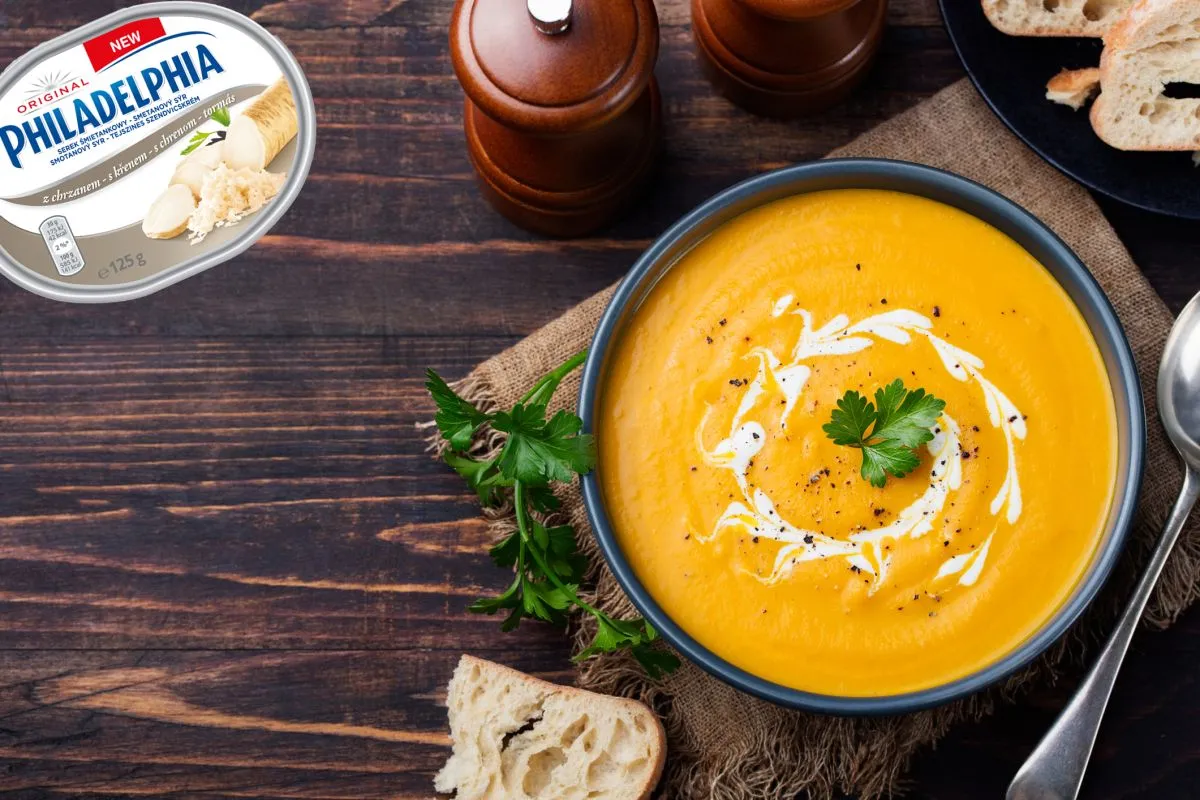 A sütőtököt hámozd meg, majd vágd félbe. A magokat egy kanál segítségével távolítsd el. Kockázd fel és apríts fel egy fej vöröshagymát. Lábasban olajon pirítsd le a hagymát és a felkockázott sütőtököt, majd öntsd fel 1 dl fehér borral és annyi vízzel, hogy ellepje. Ízesítsd két csipet sóval, egy evőkanál mézzel, majd, amikor a sütőtök megpuhult, a főzővízből vegyél ki 1 dl és keverd el fél doboz tormás Philadelphia sajtkrémmel. A keveréket öntsd a levesbe és botmixer segítségével turmixold krémesre. A Komplexebb ízélményért, tökmaggal tálald.