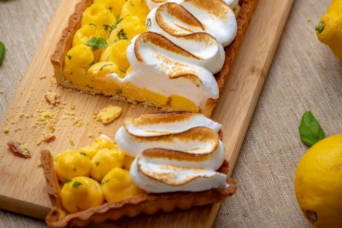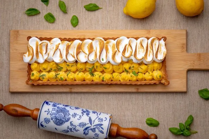 - A kihűlt linzeralapba a citromos krémmel töltött habzsákból kis gömböket nyomunk egymás mellé. A tarte egyik felére a meringue-ből hullámokat nyomunk, aprított bazsalikommal díszítjük, majd a habot cukrászfáklyával karamellizáljuk.