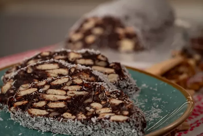 - A kekszszalámit a pihentetés után kifordítjuk a formából, leszedjük róla a sütőpapírt és ha használtunk, akkor a folpackot és a domború oldalát is alaposan bevonjuk kókuszreszelékkel. Szeletekre vágva tálaljuk.