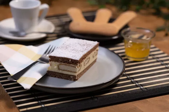 - Az egyik tésztalapot egy tálcára vagy deszkára helyezzük és ráhalmozzuk a krém felét és szépen elsimítjuk. A babapiskótákat egyesével belemártjuk a kávéba és a tésztalap rövidebb oldalával párhuzamosan két sorban ráhelyezzük a krémre.
