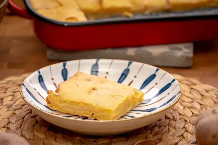 Ha vékony szeletekre vágjuk a krumplit, akkor hamarabb és biztosan átsül a pite.