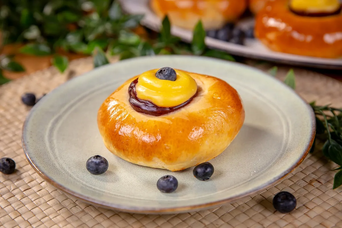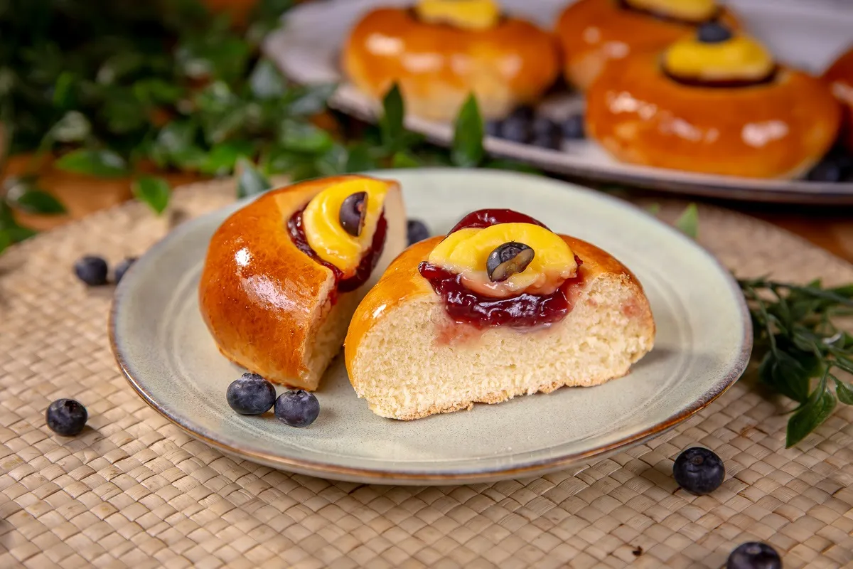 - A kapott mélyedést megtöltjük az áfonyás töltelékkel, majd a közepébe tesszük a vaníliás pudingot, úgy, hogy kilátszon körben az áfonyás. A tésztát körben lekenjük felvert tojással, és újabb 15 percig hagyjuk pihenni.