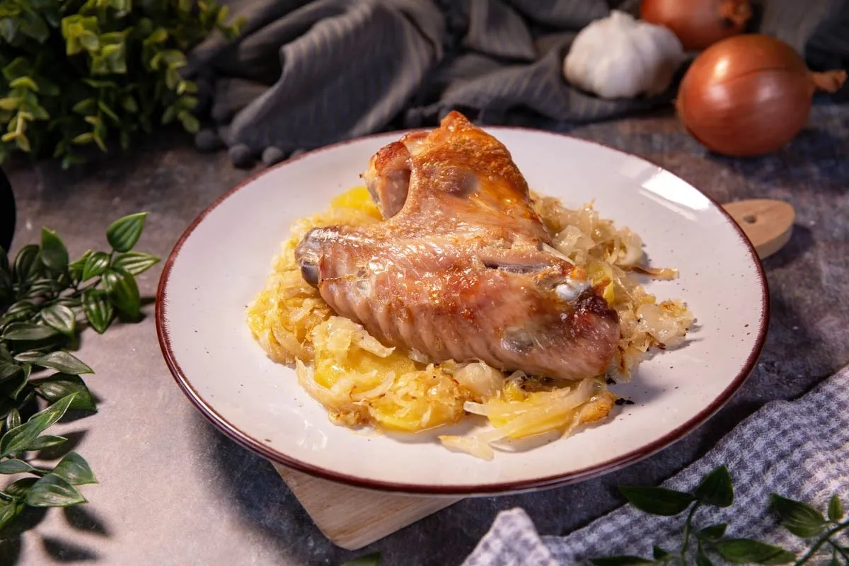 Mindössze sóval fűszereztük ezt a ropogós pulykaszárnyat, ami hagymás-krumplis káposztaágyon sült a sütőben.