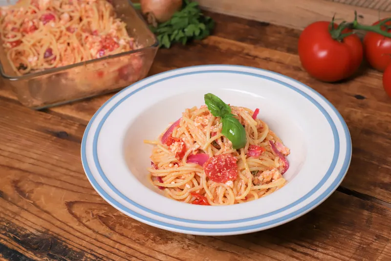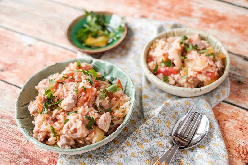 - Egy nagyobb edényben üvegesre dinszteljük a hagymát a zsíron, a szalonnakockákat zsírjára sütjük, ezután a kockára vágott tarját fehéredésig sütjük rajta. Hozzákeverjük a szintén apróra vágott paprikát, paradicsomot, fokhagymát, tovább kevergetjük, majd megsózzuk, meghintjük őrölt köménnyel, és pirospaprikával is megszórjuk. Felöntjük 2 dl sonka főzőlével (ha van, ha nincs, jó a sima is.)